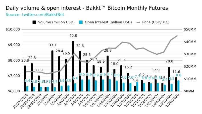 Кроме того, в последние дни стремительно растёт объём активных позиций по биткоин-фьючерсам Bakkt с ежемесячными расчётами – от $5,4 млн в пятницу до $8,8 млн во вторник.