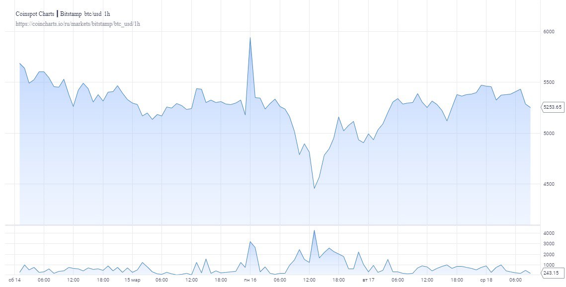 В минувший вторник, 17 марта, американский фондовый индекс S&P 500 ненадолго приблизился к 2 500 пунктам. Примерно в это же время биткоин смог отскочить до $5469.