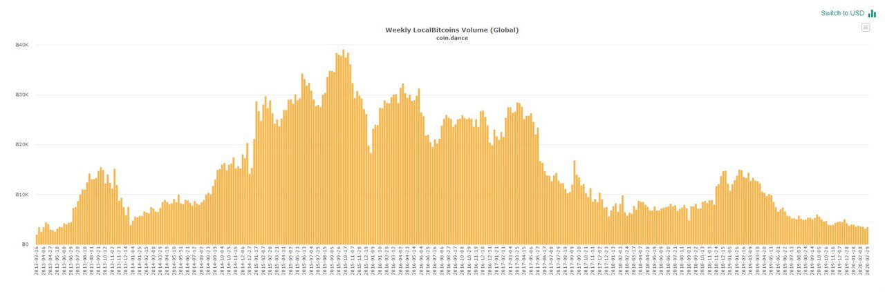 В феврале 2020 года наблюдалась устойчивая динамика снижения торговых оборотов на платформе LocalBitcoins. Об этом свидетельствуют данные популярного сервиса Coin Dance.