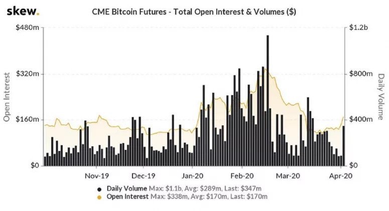По данным аналитической платформы Skew, в четверг оборот биткоин-фьючерсов на CME составил $347 млн, что является самым крупным значением с 16 марта. В предыдущий день объём торгов был равен всего $88 млн.