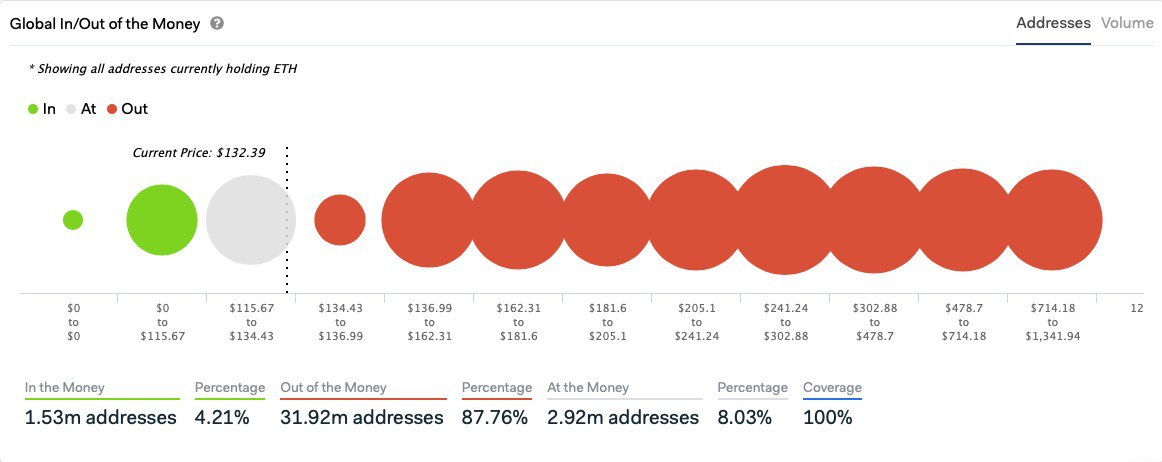 В настоящее время Ethereum торгуется около $130, установив ценовой максимум выше $1 400 в начале 2018 года и минимум около $80 в декабре того же года. Таким образом, большинство инвесторов в ETH с положительным балансом, скорее всего, приобрели криптовалюту либо на недавних минимумах, либо ещё до её подъёма в 2017 году.