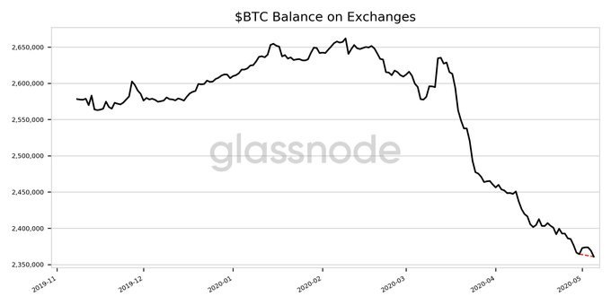 По состоянию на 7 мая на торговых площадках баланс BTC сократился до 2,360 млн монет. В конце апреля данный показатель составлял 2,364 млн биткоинов, отмечают исследователи. Такая тенденция наблюдается на протяжении нескольких недель после мартовского обвала, вошедшего в историю криптосферы как «Черный четверг».