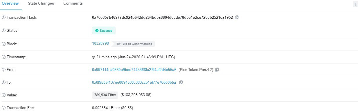 Согласно Etherscan, в 16:46 МСК 789 534 ETH покинули кошелёк с меткой «Plus Token Ponzi 2» и отправились на неизвестный адрес, вероятно, для дальнейшего смешивания с целью сокрытия происхождения и перемещения средств.