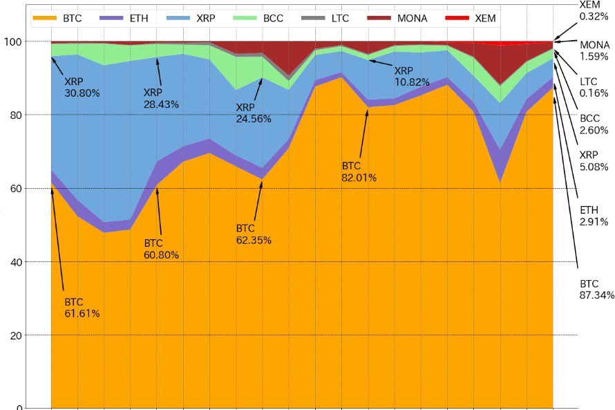 Исследователи выяснили, что инвесторы массово отказываются от XRP и других альткоинов в пользу BTC. Доля биткоин-транзакций от общего объема сделок на криптобиржах достигла 87%.