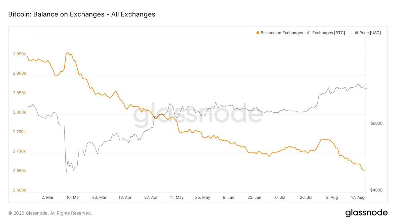 По данным аналитической фирмы Glassnode, количество биткоинов на биржах снизилось от 2,96 млн BTC в феврале до текущих 2,59 млн BTC.