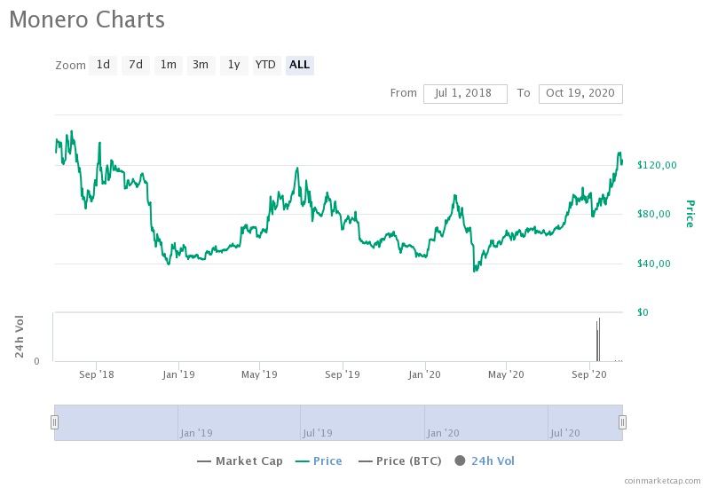 В преддверии форка монета взлетала до $128 - это максимальный показатель с конца июля 2018 года. После обновления произошла небольшая коррекция, и сегодня Monero торгуется на уровне $122,3. Рыночная капитализация XMR составляет чуть более $2,168 млрд.