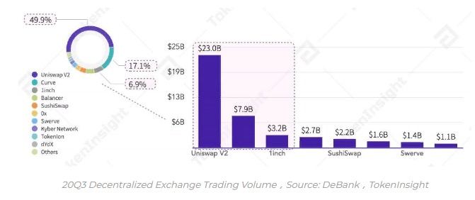 В течение всего третьего квартала 2020 года наблюдалось увеличение торговой активности на децентрализованных биржах. В среднем, ежемесячно обороты DEX возрастали более чем на 140%. До половины от общего объема торгов пришлось на биржу UniSwap.