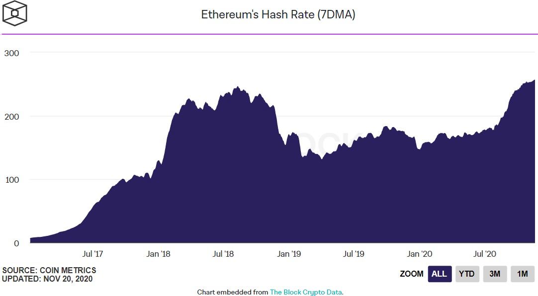 Тем временем, продолжается рост объема вычислительных мощностей в сети Ethereum. По данным The Block, вчера средний семидневный показатель превысил 256 терахешей в секунду (Th/s), что является абсолютным максимумом.