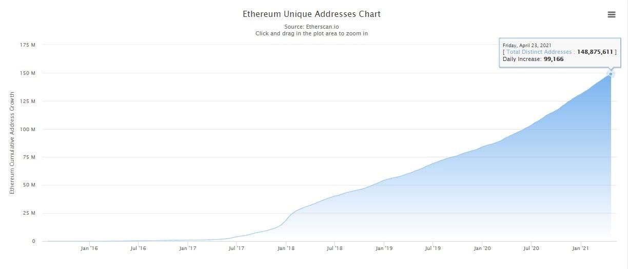 По данным EtherScan, сейчас в сети эфириума насчитывается более 148,8 млн уникальных адресов.