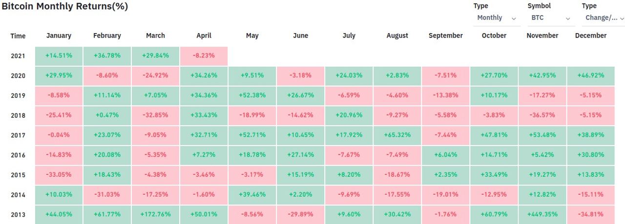 Текущий месяц обещает стать вторым по процентному снижению цены биткоина в истории криптовалюты. В момент публикации BTC торгуется около $36 200, что соответствует падению на 37,5% относительно цены открытия майской свечи. Это больше, чем в ноябре 2018 года, когда биткоин упал на 37%, и лишь немного меньше значения сентября 2011 года, когда снижение составило 40%. В 2017 и 2019 годах в мае цена биткоина поднималась более чем на 50%.