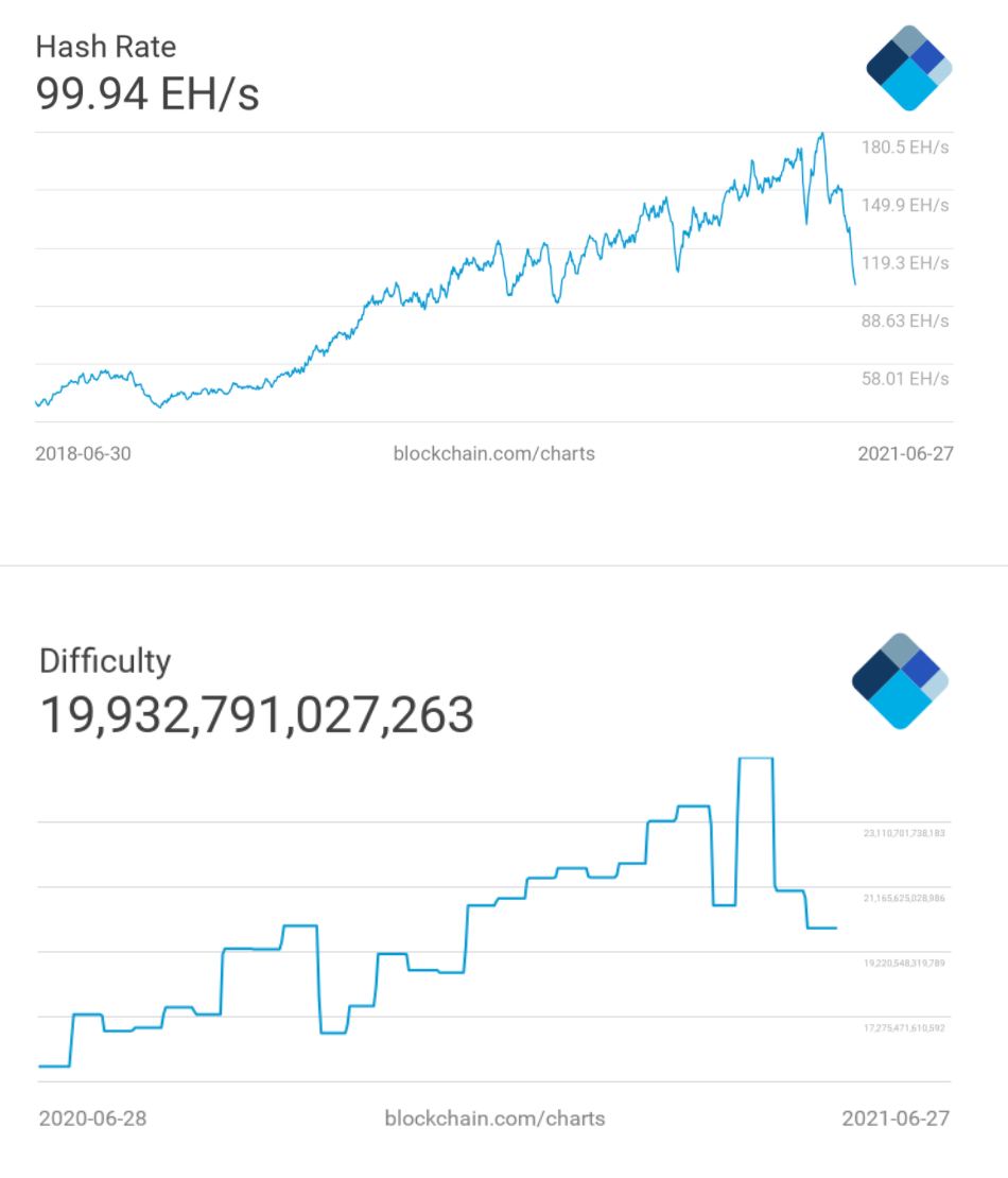 Впервые с мая 2020 года хешрейт рухнул ниже 100 экзахеш в секунду (EH/s). Сегодня данный показатель опустился до 99,96 EH/s. Об этом свидетельствуют данные сервиса Blockchain.com.