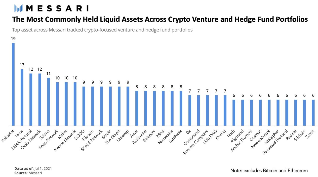 В июле по-прежнему лидирует Polkadot (DOT). Он обнаружился в портфелях 19 из 44 или 43% рассмотренных инвесторов, все из которых так или иначе заинтересованы в успехе системы смарт-контрактов. Аналитики исходили из того, что большинство фондов держит биткоин и эфир, поэтому они не были включены в доклад.