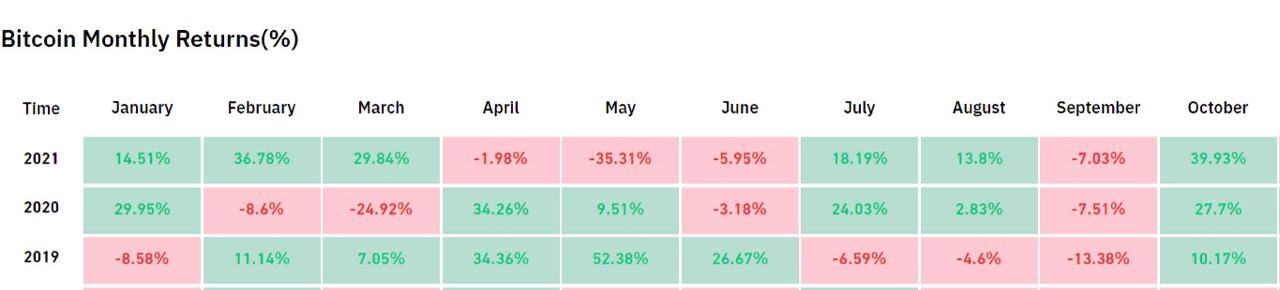 С 2019 года биткоин (BTC) стабильно завершал октябрь в зеленой зоне. Не стал исключением и прошлый месяц 2021 года, за последние 30 дней стоимость криптовалюты взлетела на 39,93%. В 2019 и 2020 годах октябрь финишировал укреплением курса BTC на 10,17% и 27,7% соответственно (по данным ByBt).