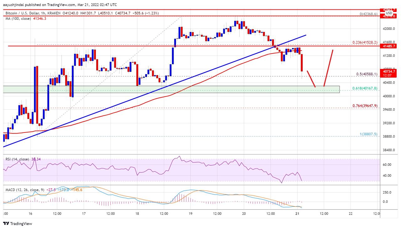 Курс биткоина в понедельник, 21 марта, упал утром ниже $41 000. Затем BTC немного отыгрался, и сейчас он торгуется на отметке $41 309.