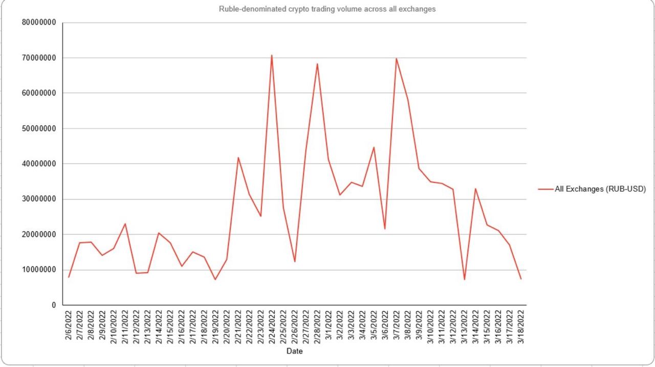 Объем рублевых торгов криптовалютами возрастал с конца февраля. 7 марта сумма сделок достигала пиковых значений на уровне $70 млн, говорится в докладе компании Chainalysis. Однако затем началось падение инвестиций россиян в цифровые активы через валюту РФ. Среднесуточная сумма сделок рухнула более чем на 50%.