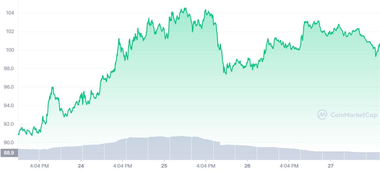 Альткоин SOL, базирующийся на блокчейне Solana, за последние семь дней вырос в стоимости на 15,19%. Его курс укрепился до $102,45.