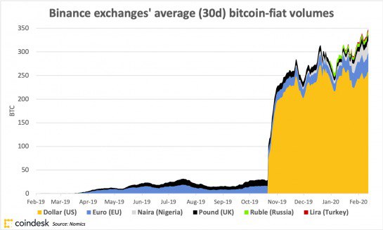По данным CoinDesk, на фиатные валюты приходится небольшая доля в общем объёме торгов Binance. Средний объём торгов платформы за 30 дней составил $3,55 млрд, из них на пары с фиатом пришлось $3,5 млн. Подавляющая часть этого объёма приходится на доллар США.