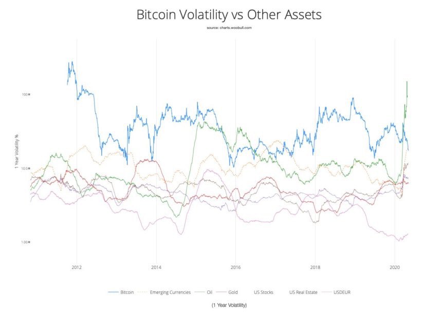 Если посмотреть на график, представленный аналитиками, то можно увидеть,ю что перед майским халвингом (сокращением награды майнеров) волатильность биткоина ослабла.