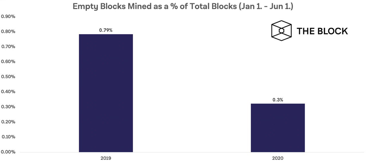 По сравнению с предыдущими годами майнеры стали добывать меньше пустых блоков. С 1 января по 1 июня таких блоков было всего 0,3% в общем объёме. Это заметное снижение по сравнению с тем же периодом прошлого года, когда значение составляло 0,79%.