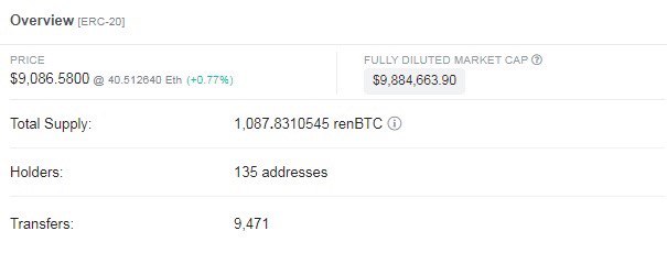 На втором месте находится RenBTC, вышедший на рынок в середине мая. К сегодняшнему дню было создано немногим больше 1 000 монет RenBTC на сумму около $10 млн.