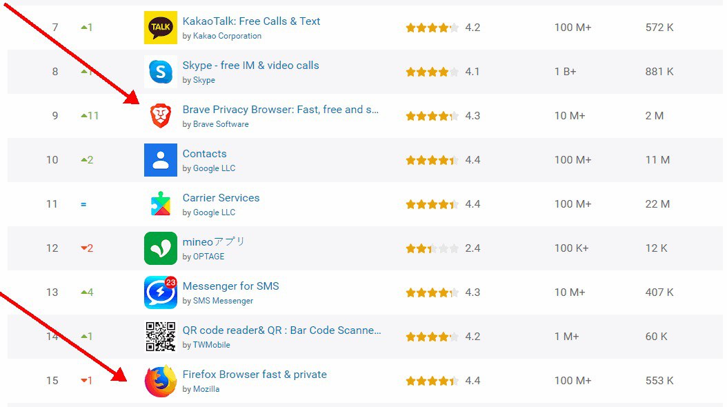 Согласно размещённому на Reddit скриншоту, в Японии за последний месяц Brave был скачан более 2 млн раз, а Firefox – 553 000.