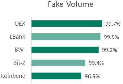 Самые крупные объёмы фиктивных сделок среди реальных платформ были замечены на биржах OKEx и Bibox. «Фейковые объёмы на таких биржах превышают 75%. Тем не менее, их реальные объёмы по-прежнему позволяют им входить в ведущую двадцатку», – заявляют авторы доклада.