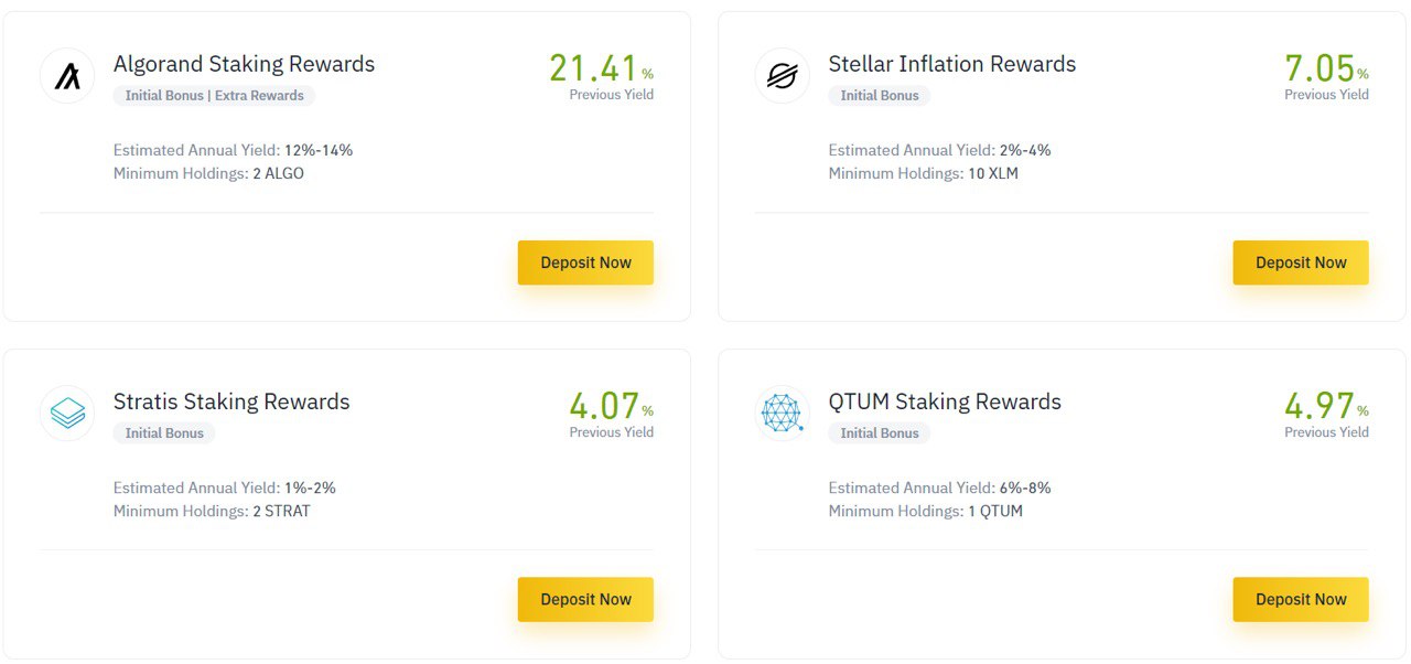 В соответствии с последними тенденциями в криптовалютной отрасли биржа Binance в четверг объявила о запуске платформы для стекинга цифровых активов. На начальном этапе пользователям предлагается осуществлять стекинг NEO (NEO/GAS), Ontology (ONT/ONG), Vechain (VEN/VTHO), Stellar (XLM), Komodo (KMD), Algorand (ALGO), Qtum (QTUM) и Stratis (STRAT).