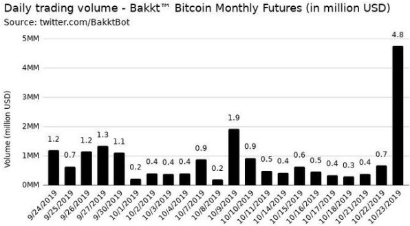 В случае поставочных фьючерсов Bakkt одному контракту соответствует один биткоин в объёме торгов. Таким образом, оборот по фьючерсам с расчётом в ноябре составил $4,8 млн. Ранее максимальный объём для этого типа контрактов был равен $1,9 млн или 224 BTC. С момента запуска 23 сентября совокупный объём торгов на Bakkt достиг $20 млн.