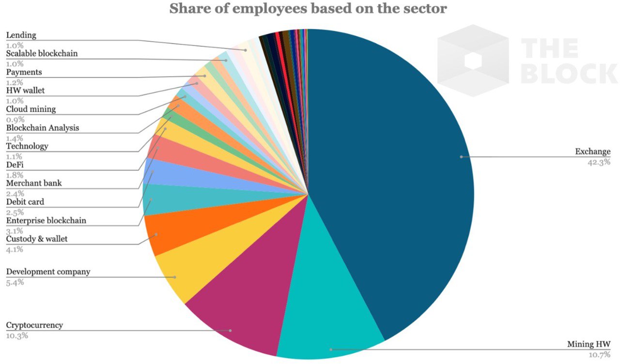 42% сотрудников в сфере блокчейна работают на биржи криптовалют, свидетельствуют данные исследования портала The Block.