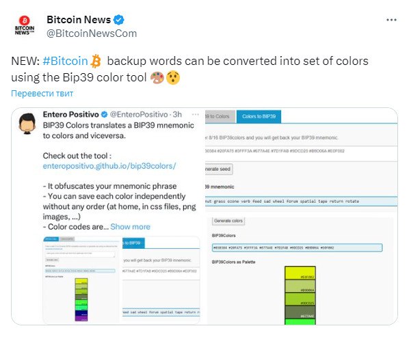 🎨 С помощью инструмента цвета Bip39, можно преобразовать свои секретные фразы для восстановления доступа в набор цветов