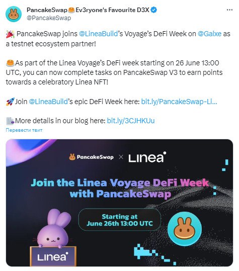 💰PancakeSwap присоединяется к DeFi Voyage Week от Linea на платформе Galxe в качестве партнера экосистемы тестовой сети!