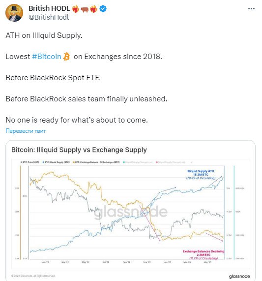 Самый низкий уровень предложения BTC на биржах с 2018 года.