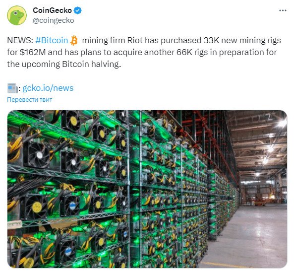 🏭 Майнинговая компания Riot приобрела 33 000 новых майнинг-ферм за 162 млн долларов .(и планирует приобрести еще 66 000) в рамках подготовки к предстоящему халвингу биткоина.