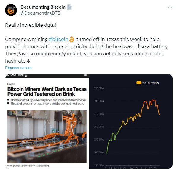 🥵 Если вы заметили значительное падение хешрейта сети Bitcoin, то это майнеры Техаса спасали жителей штата от аномальной жары, выключив часть своего оборудования для того, обеспечить дополнительным электричеством работу кондиционеров!