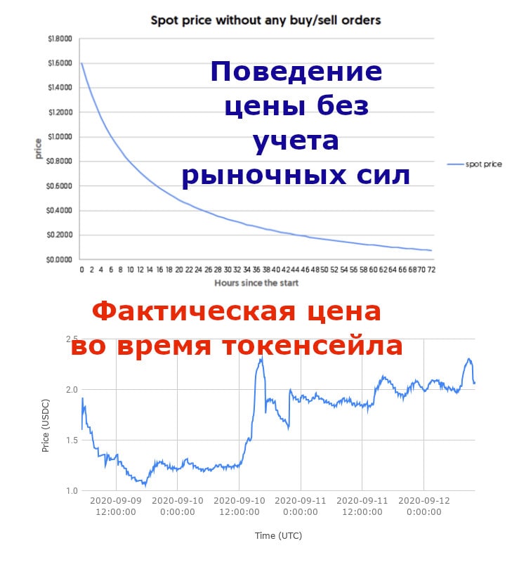 4️⃣ В разборе от Bankless есть пример, как проходил сейл в таком же формате у Perpetual Protocol. В теории при отсутствии сделок цена падала бы с $1.6 практически до нуля. На практике цена колебалась от $1 до $2.3 примерно.