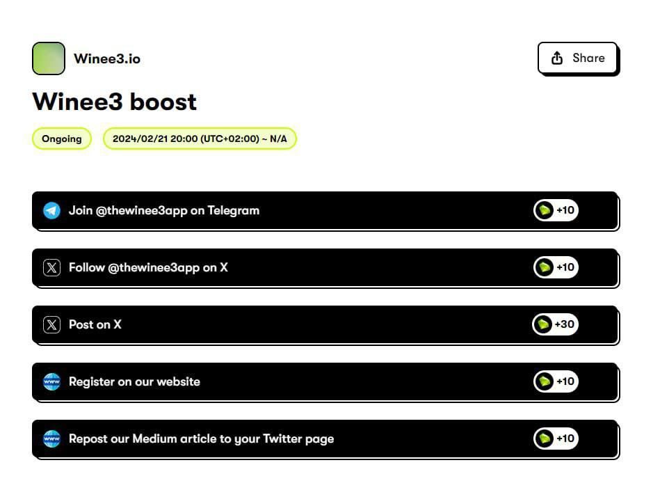 👀 Недавно проект раздавал бесплатные аллокации, теперь Winee3 запустил квесты с лёгкими заданиями, выполняя которые можно получать баллы и далее претендовать на вознаграждение!