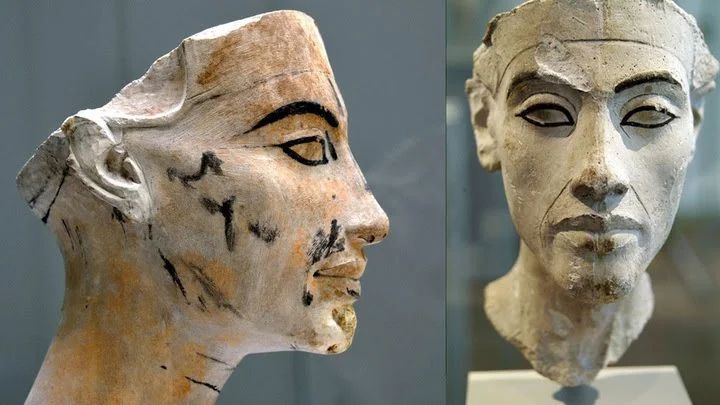 Покажу тебе неконченные портреты красотки #Нефертити (слева) и самовлюбленного дурачка #Эхнатона. Работа того же #Тутмоса_Младшего. Скульптор оставил разметку чёрной краской аж 3359 лет назад!!👇