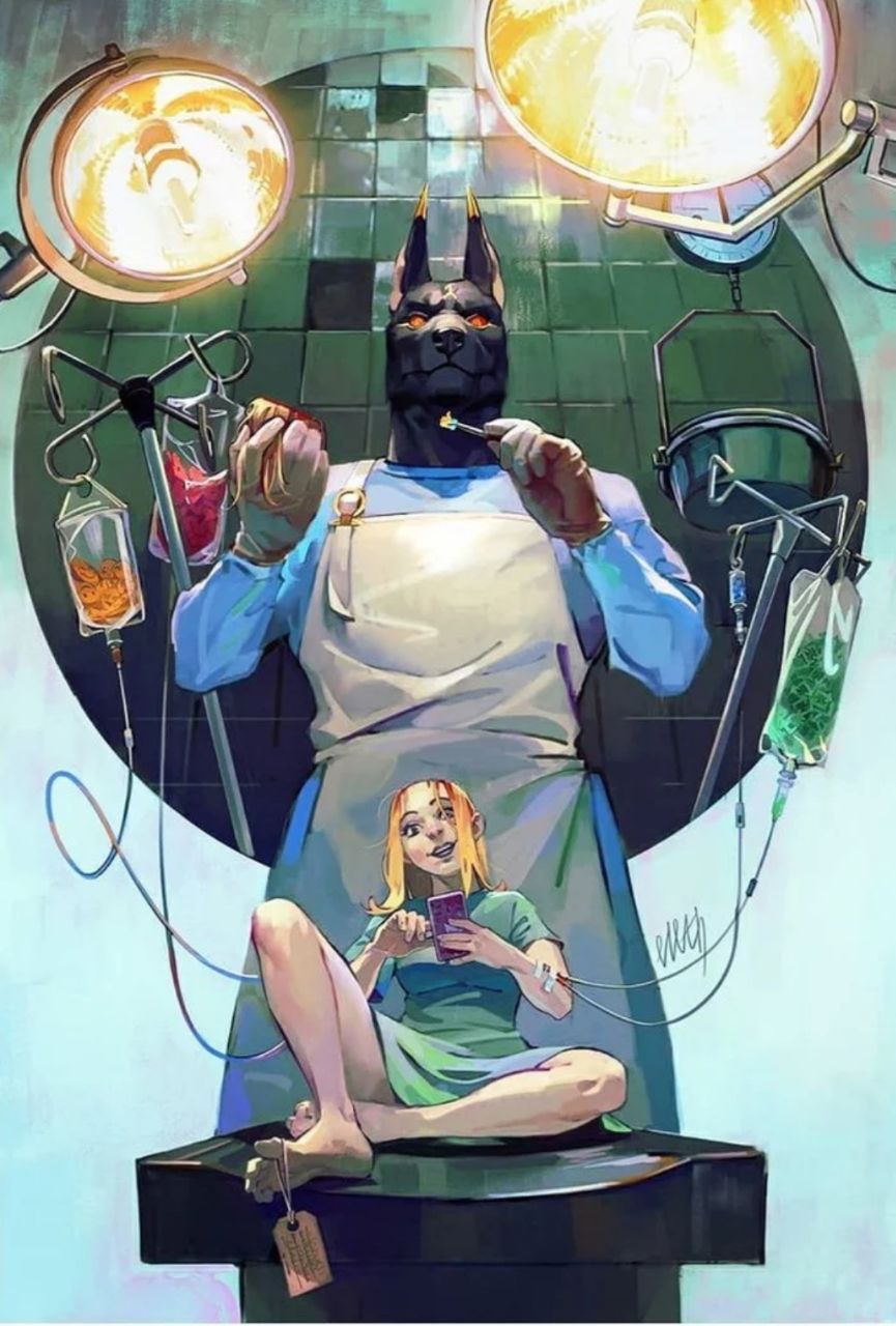 Обрати внимание, какой шикардосный арт Юлии Журавлевой. 👇👇👇В одной руке Бог бальзамирования держит верхнюю часть черепа жизнерадостной, андроидозависимой жмурочки.