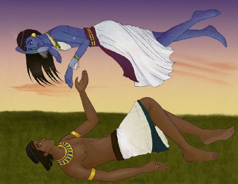 Дорогие Олег и Камилла. На рисунке действительно изображены боги #Нут (небо) и Геб (земля). Они не только муж и жена, но и близнецы. Дети Бога воздуха Шу и Богини влаги Тефнут. В процессе сотворения мира Шу отделил свою дочку от земли и удерживал так на простертых руках.