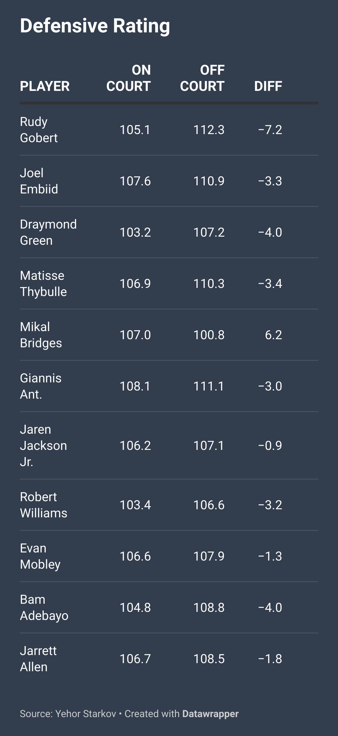 Один з лідерів ліги за універсальністю, за складністю матчапів, за імпактом в захист команди (до речі, показники в таблиці - це не їх спільні виступи з ДжоДжо, там разом набагато гірше, а ось без Ембііда якраз чудові цифри). Шкода, що Карузо/Болл не награли достатньо, там також дуже сильні кейси.