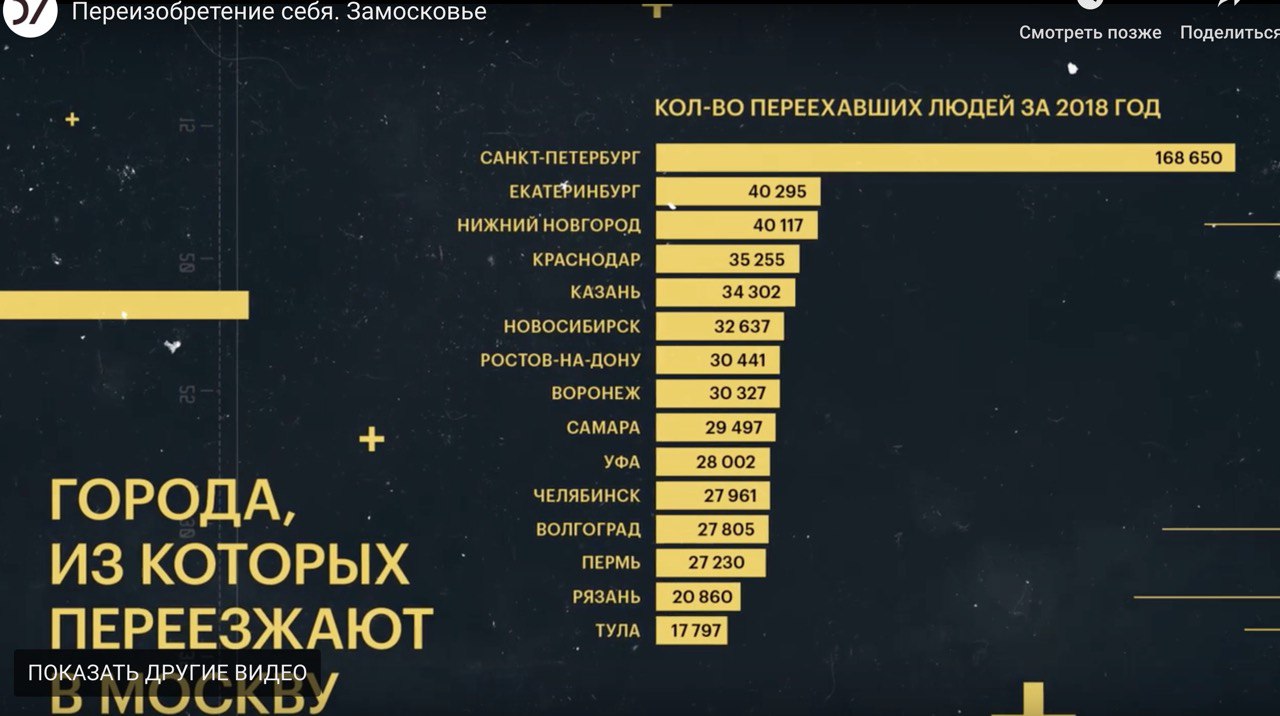 📈Зашел я сегодня посмотреть очередную серию «Открытого университета» про Подмосковье и увидел до ужаса знакомые цифры на диаграмме). Ребята просто взяли цифры из материала «Стрелки» и прикрутили к графику другой заголовок. Проблема в том, что для «Стрелки» мы считали число пользователей, которые указали отличный от Москвы родной город в профиле Вконтакте. А у «Открытого университета» пользователи превратились в реальных людей.