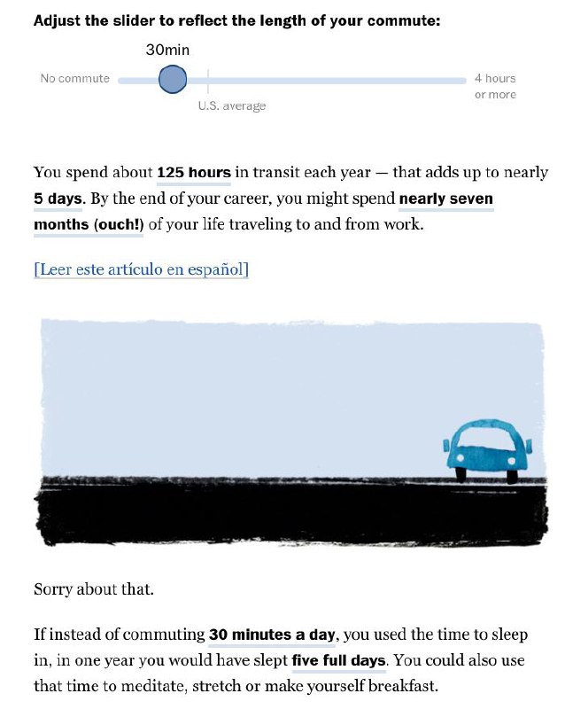 В WP сделали калькулятор комьюта. Комьют — это термин, который означает время в пути на работу и с работы. Тема особенно актуальна с 2020 года, теперь для многих из нас комьют — переползти из кровати в рабочее кресло (у меня еще меньше — я просто беру ноут в постель).