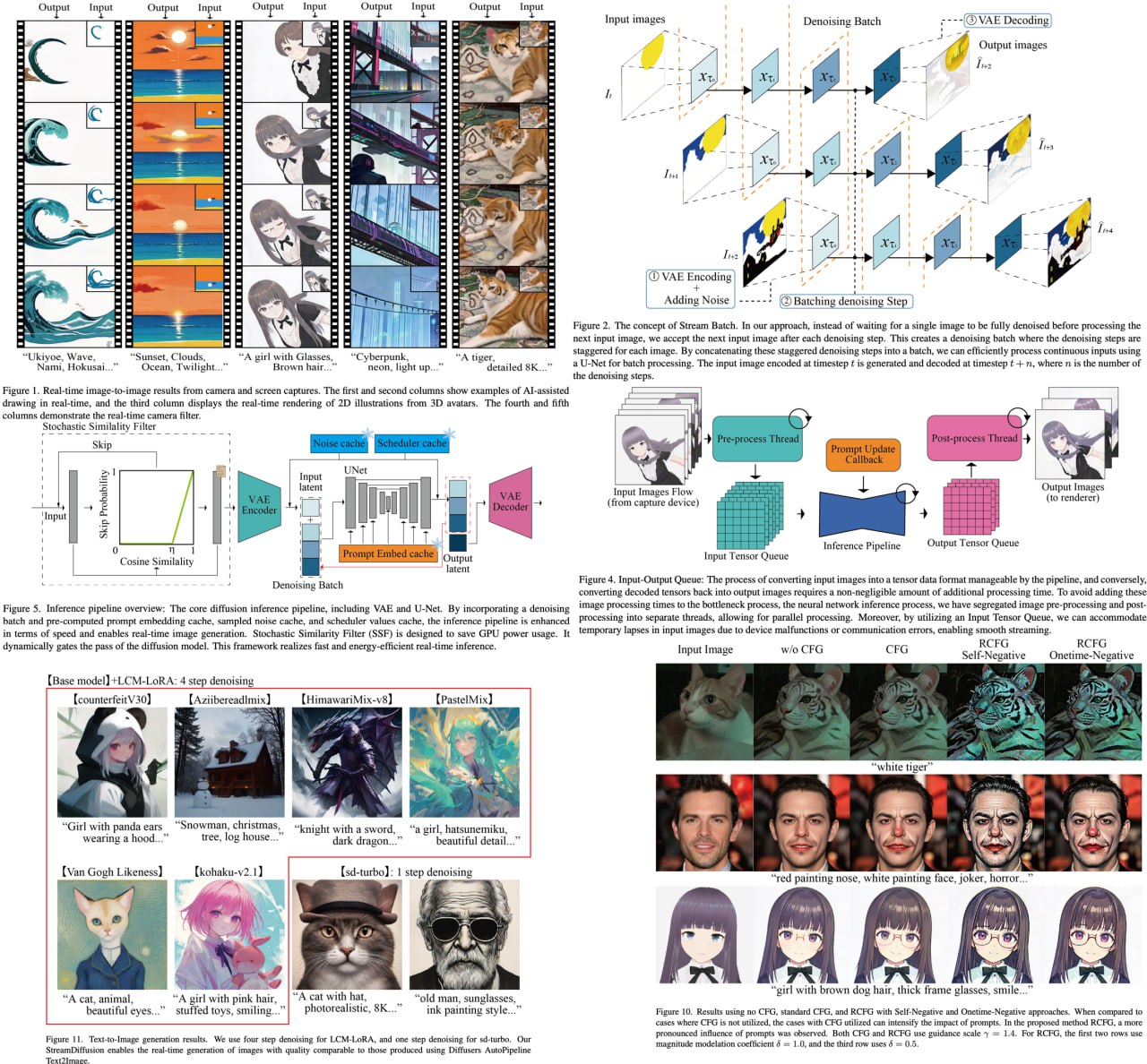 StreamDiffusion - это новаторский real-time диффузионный пайплайн для интерактивной генерации изображений, улучшающий существующие модели диффузии. Он преобразует sequntial denoising в batch denoising, повышая пропускную способность. Включает новую систему input-output для параллелизации и использует алгоритм RCFG для сокращения вычислений в U-Net. Также вводится фильтр SSF для оптимизации энергопотребления. StreamDiffusion достигает ускорения в 1.5x по сравнению с обычными методами и до 2.05x быстрее, чем CFG. Сочетание предложенных стратегий и существующих инструментов ускорения позволяет достичь до 91.07fps на RTX4090, улучшая пропускную способность AutoPipeline от Diffusers более чем в 59 раз. Кроме того, значительно снижает энергопотребление - до 2.39x на RTX3060 и до 1.99x на RTX4090.