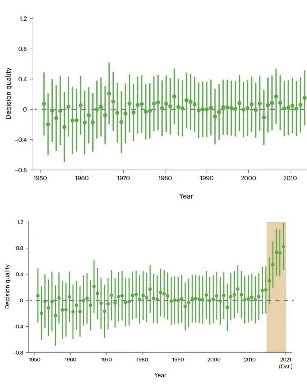 В статье пишут, что после появлени AlphaGo резко заметно выросла креативность людей, играющих в Go. Метрика - decision quality. Что это за метрика, я не совсем понял, вроде средняя вероятность того, что ходы приведут к победе.