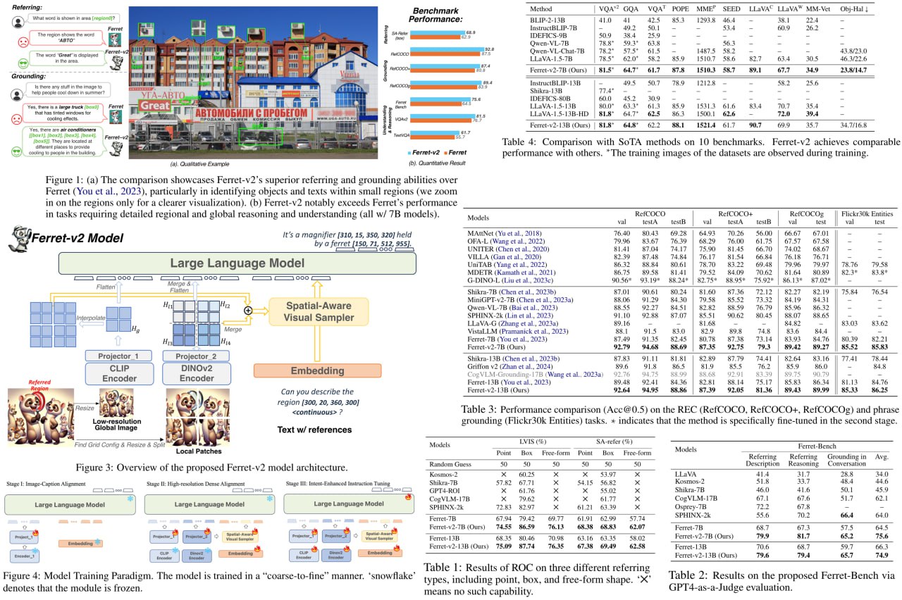 Ferret-v2 включает в себя три ключевых изменения: гибкое решение для работы с изображениями любого разрешения, интеграция дополнительного энкодера DINOv2 для обработки информации на разных уровнях детализации и тренировка в три этапа - image-caption alignment, high-resolution dense alignment и instruction tuning. Эксперименты показывают, что Ferret-v2 значительно превосходит предыдущую версию и другие SOTA подходы (ну кто же будет писать в статье, что их модель не лучшая).