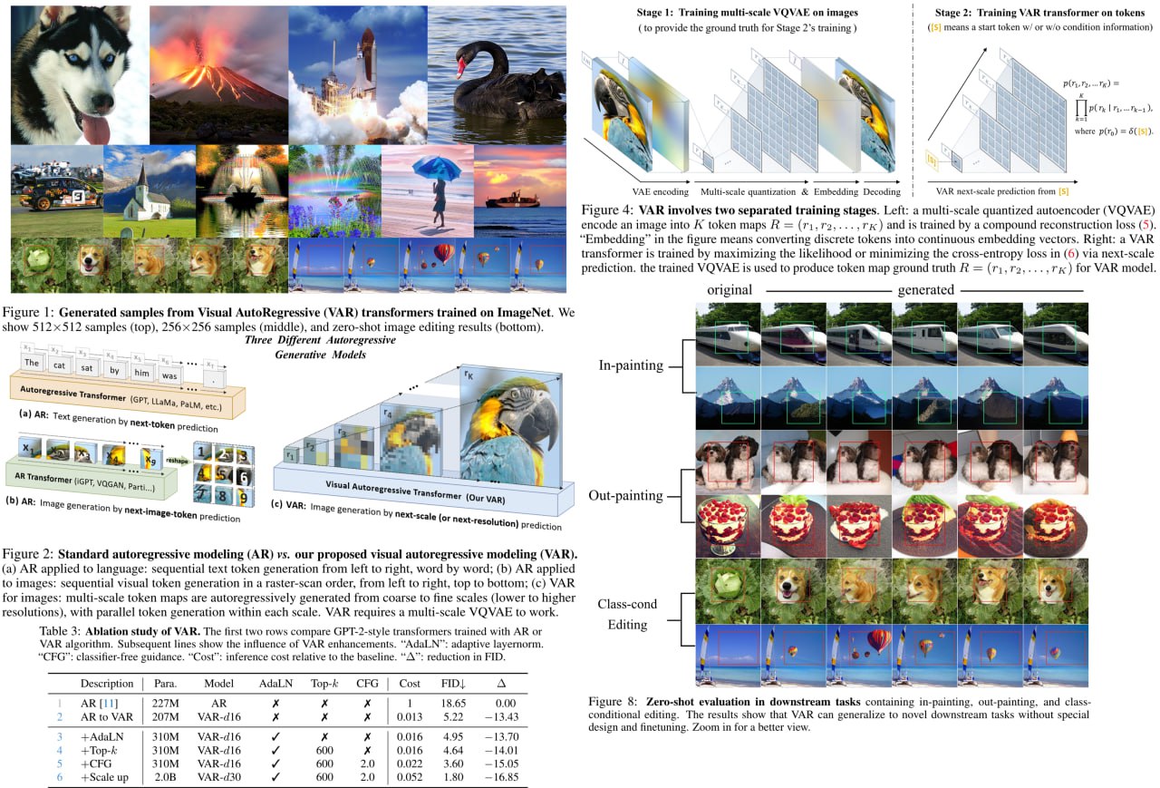 VAR (Visual AutoRegressive modeling) - новый подход к autoregressive тренировке моделей для генерации картинок, работающий как next-scale prediction / next-resolution prediction вместо next-token prediction. В результате на ImageNet 256x256 этот подход обошёл модели диффуризий (правда сравнивали лишь с DiT) уменьшил FID с 18.65 до 1.80 и увеличил IS с 80.4 до 356.4, при этом скорость инференса увеличилась в 20 раз. VAR также демонстрирует power-law scaling laws аналогично LLM.