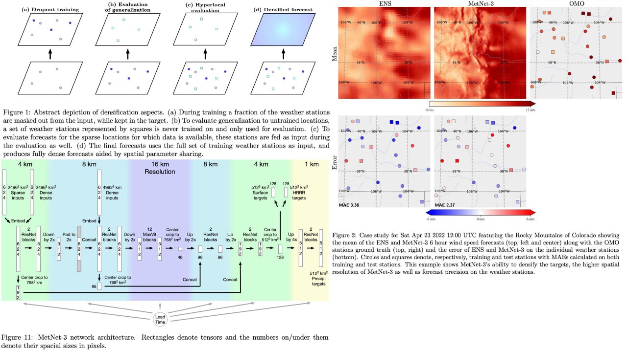 In a major breakthrough, MetNet-3 extends the capabilities of neural models both in terms of lead time and the range of weather variables it can predict accurately. It can forecast up to 24 hours ahead for variables including precipitation, wind, temperature, and dew point. A key innovation in MetNet-3 is its densification technique, which enables it to generate spatially dense forecasts despite being trained on extremely sparse data. This advanced model outperforms leading single- and multi-member Numerical Weather Prediction models, such as HRRR and ENS, particularly over the CONUS region for up to a full day ahead. Moreover, MetNet-3 has been integrated into Google Search, making its advanced forecasts widely accessible.