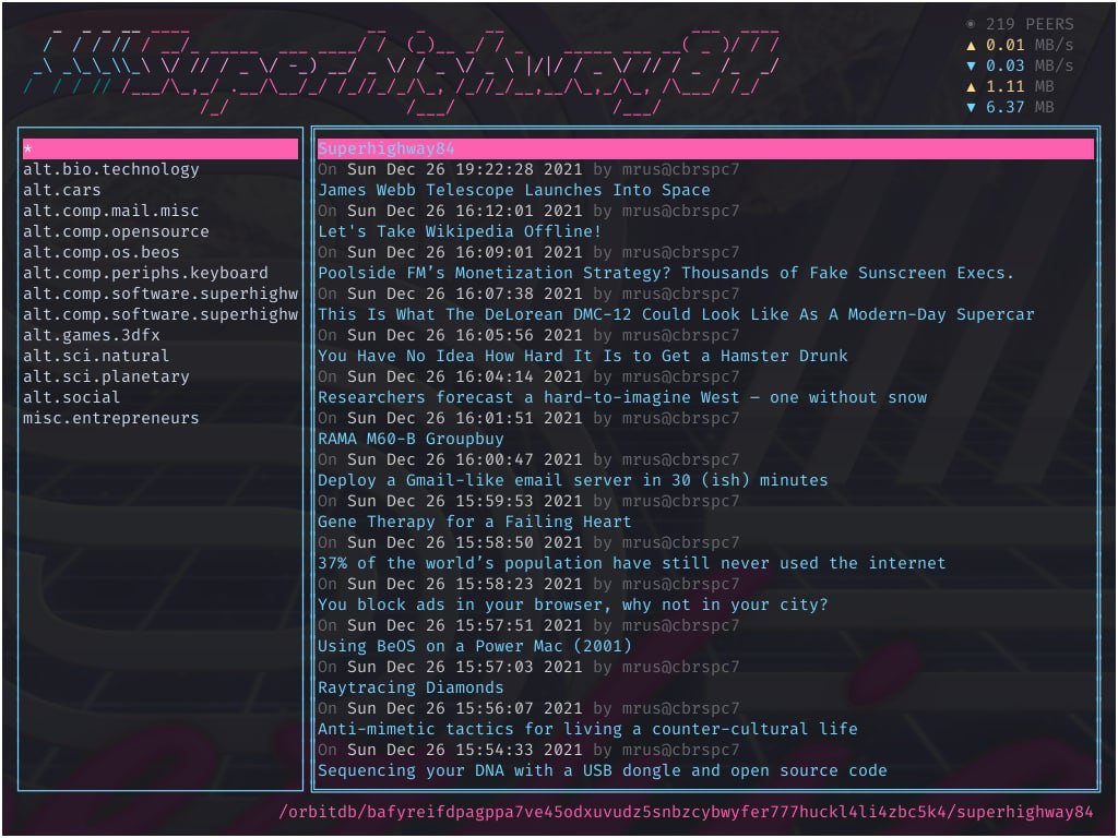 Децентрализованная одноранговая интернет-дискуссионная система с открытым исходным кодом, основанная на IPFS и вдохновленная USENET, с ретро-эстетикой.