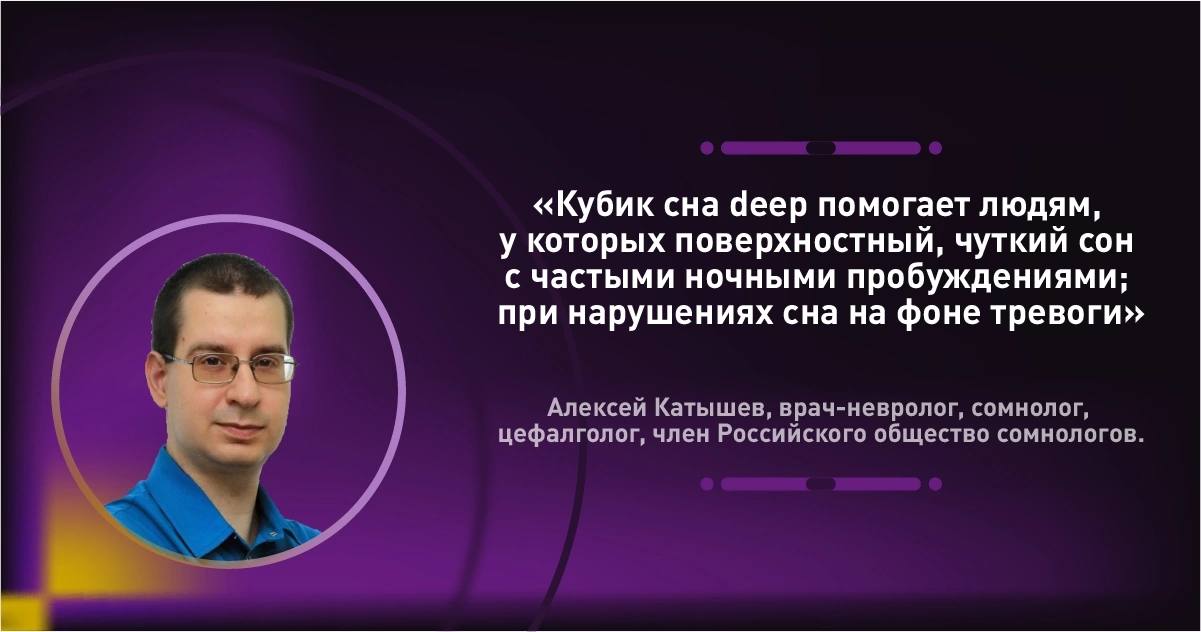 💬"Кубик сна deep в первую очередь помогает людям, у которых поверхностный, чуткий сон с частыми ночными пробуждениями; при нарушениях сна на фоне тревоги; а также отлично подойдет тем, кто не испытывает серьезных или постоянных проблем со сном, а просто хочет сделать свой ночной отдых еще эффективнее. И конечно, кубик не показан тем, кто страдает многолетней тяжелой бессонницей и принимает снотворные препараты – это не волшебное средство, способное исцелить любую бессонницу. Стильный дизайн делает кубик сна deep отличным и полезным подарком.