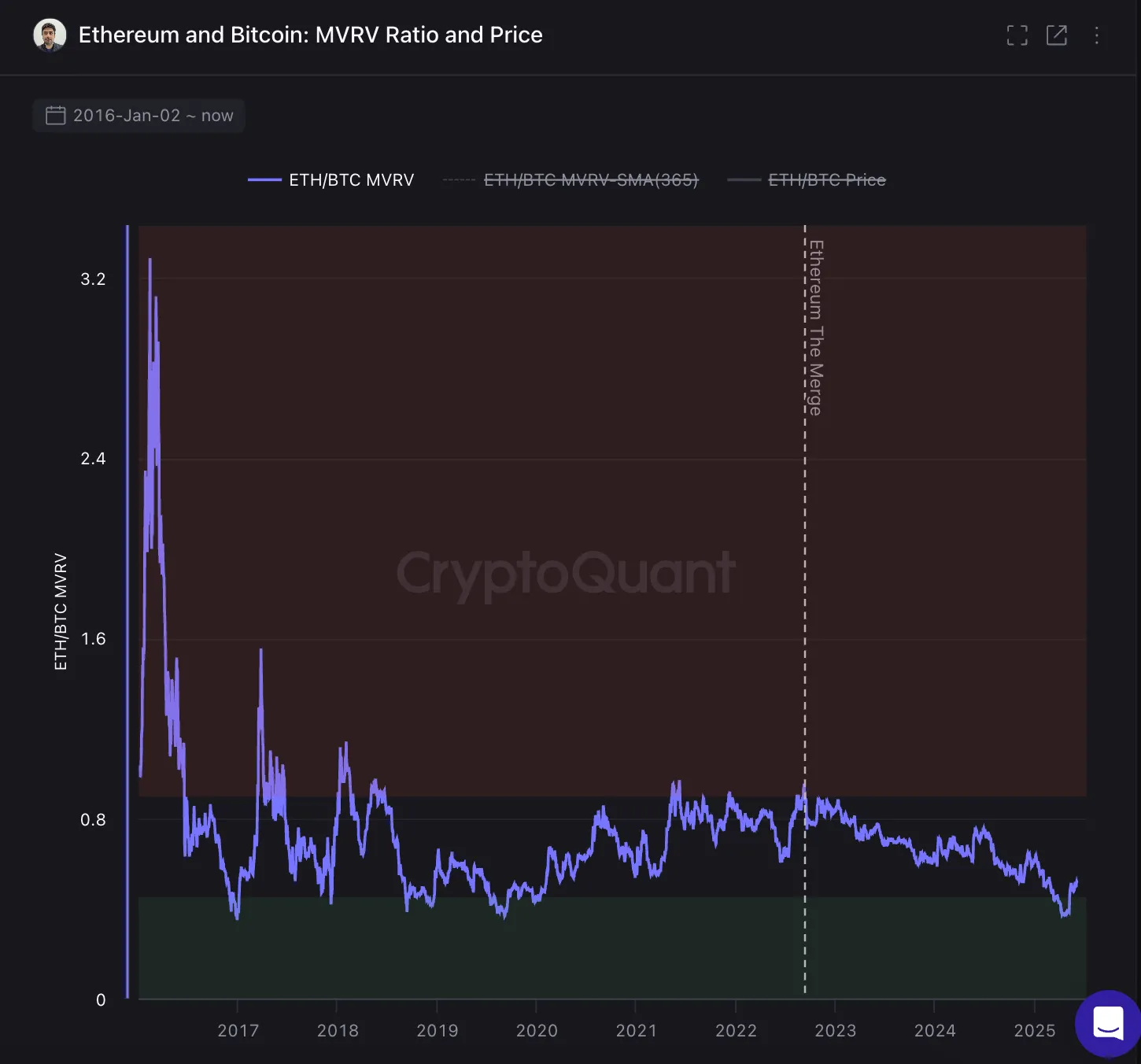 Но с структурной точки зрения, MVRV ETH/BTC только что отскочил от многолетних минимумов, что сигнализирует о потенциальной недооценке.
